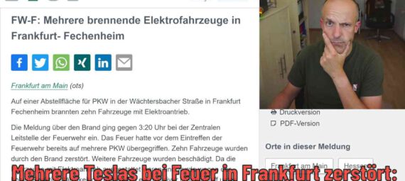Jetzt bietet sich die nächste „Gelegenheit“ für diese Medien, sich über das Elektroauto her zu machen. In Frankfurt haben nach aktuellen Erkentnissen 10 Teslas gebrannt und weitere Fahrzeuge wurden beschädigt. Die eigentliche Brandursache ich unbekannt. Bild.de mutmaßt bereits, ob es sich eventuell um eine „Selbstenzündung“ handelt.