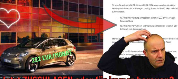 Ralf hat mich auf ein aktuelles Angebot von Volkswagen für den VW ID.3 hingewiesen. Schon ab 222 Euro Leasingrate im Monat und einem Leasingfaktor von rund 0,70 kann man für zwei Jahre einen Stromer von den Wolfsburgern leasen.